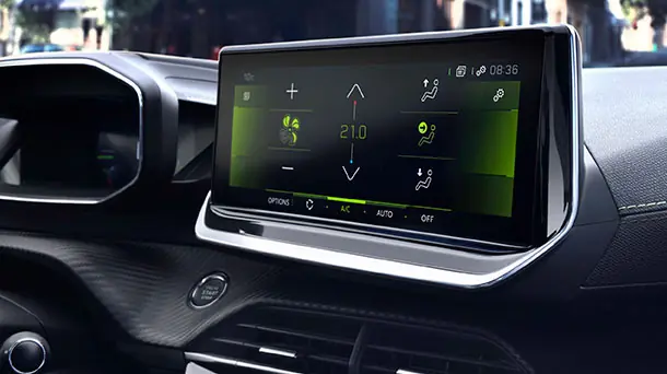 PEUGEOT I-Cockpit, der består af et lille rat, et head-up instrumentpanel og en stor touch-skærm, giver stimulerende, instinktiv og sikker kørsel.